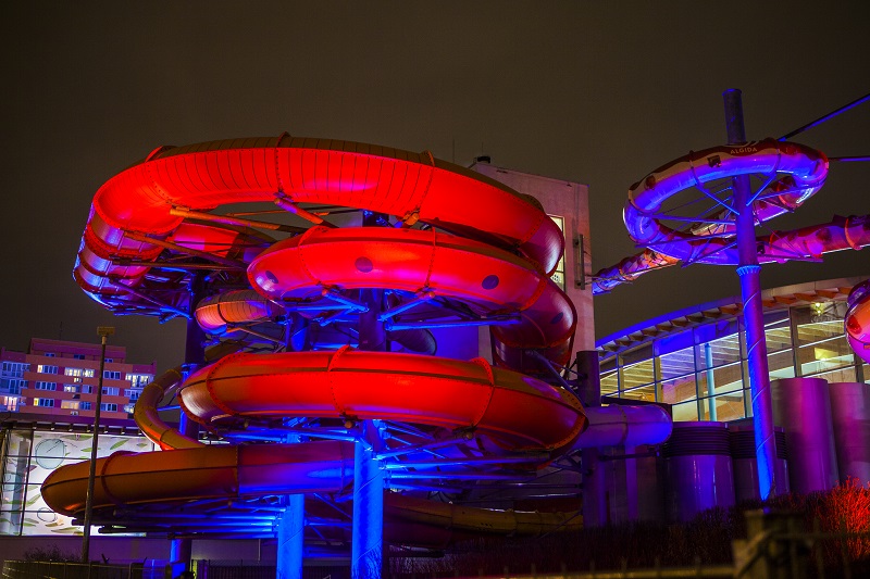 A ‘Strawberry-shaped’ landing area is an additional attraction of the multimedia slide; the descent may be continued by swimming into the Lazy River.