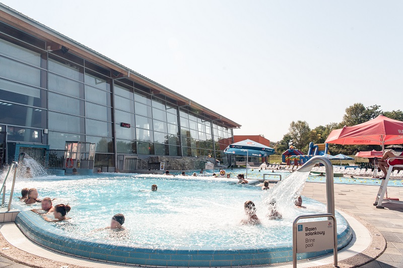 Outdoor brine pool with geysers and showers – guarantees relax.