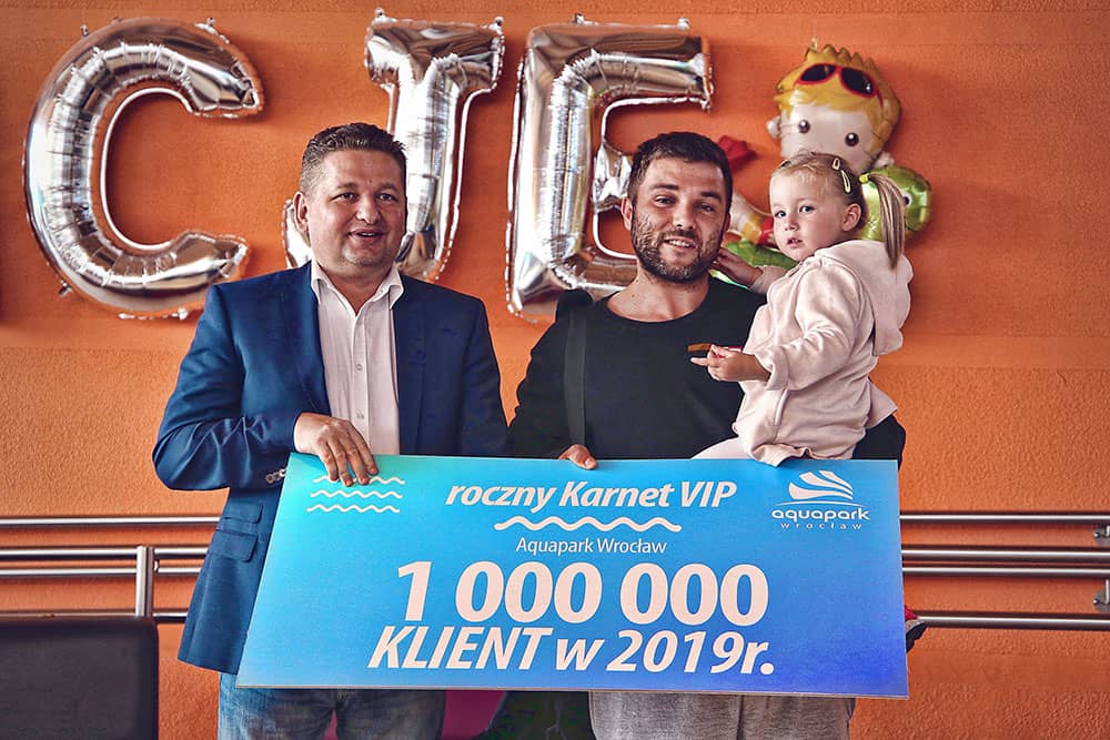 We wtorek 16 lipca Aquapark Wrocław przywitał w swoich progach milionowego klienta w 2019 roku. Około 11:50 na kasie Basenów Rekreacyjnych zostało nabite milionowe wejście. Z tej okazji Pan Maciej Kwiatkowski i jego córeczka Ola w ramach przygotowanej niespodzianki otrzymali od wrocławskiego aquaparku roczny karnet VIP oraz kilka biletów jednorazowych.